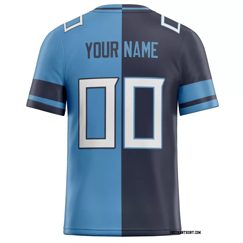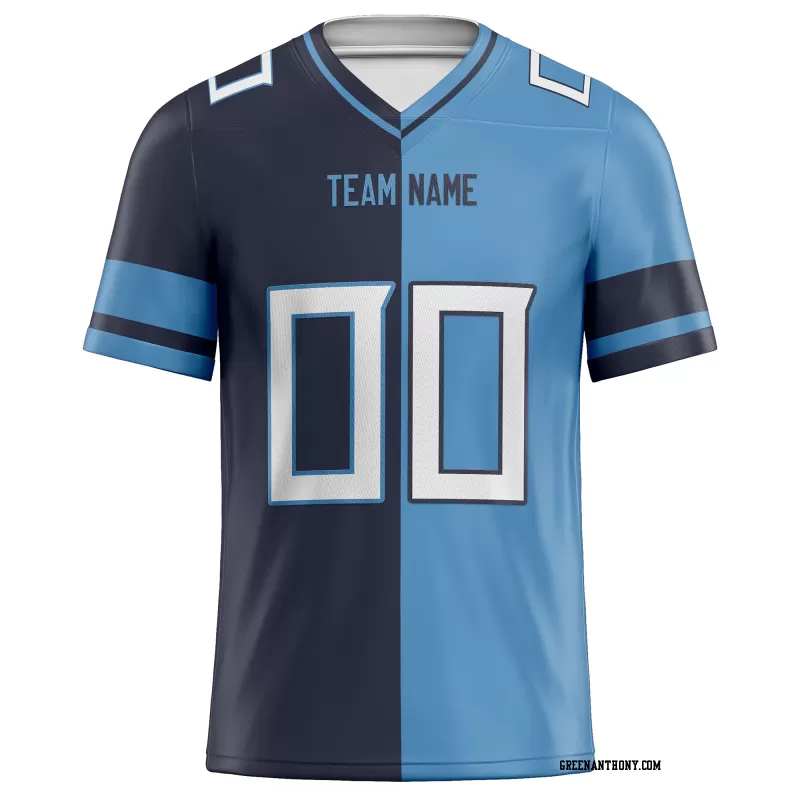 Explore the Printed Customized Split Navy Light Blue White Football Jersey – a blend of vibrant colors and personalization, designed to make you stand out on the field. Perfect for football enthusiasts seeking a unique touch.