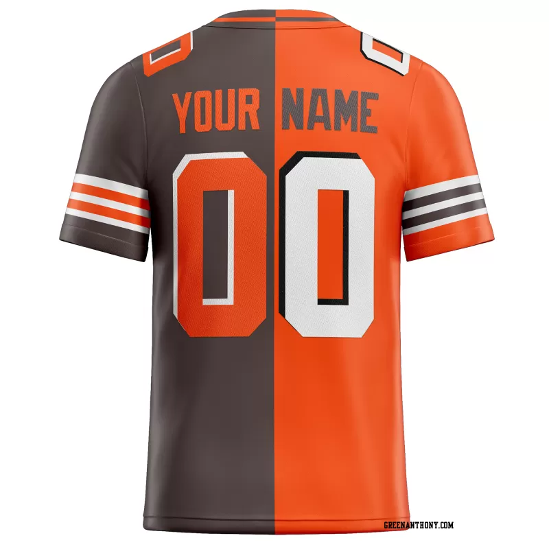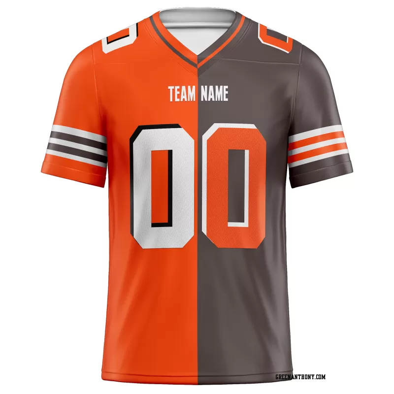 Explore the Printed Customized Split Orange Brown White Football Jersey – a blend of vibrant colors and personalization, designed to make you stand out on the field. Perfect for football enthusiasts seeking a unique touch.