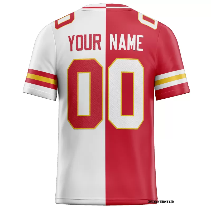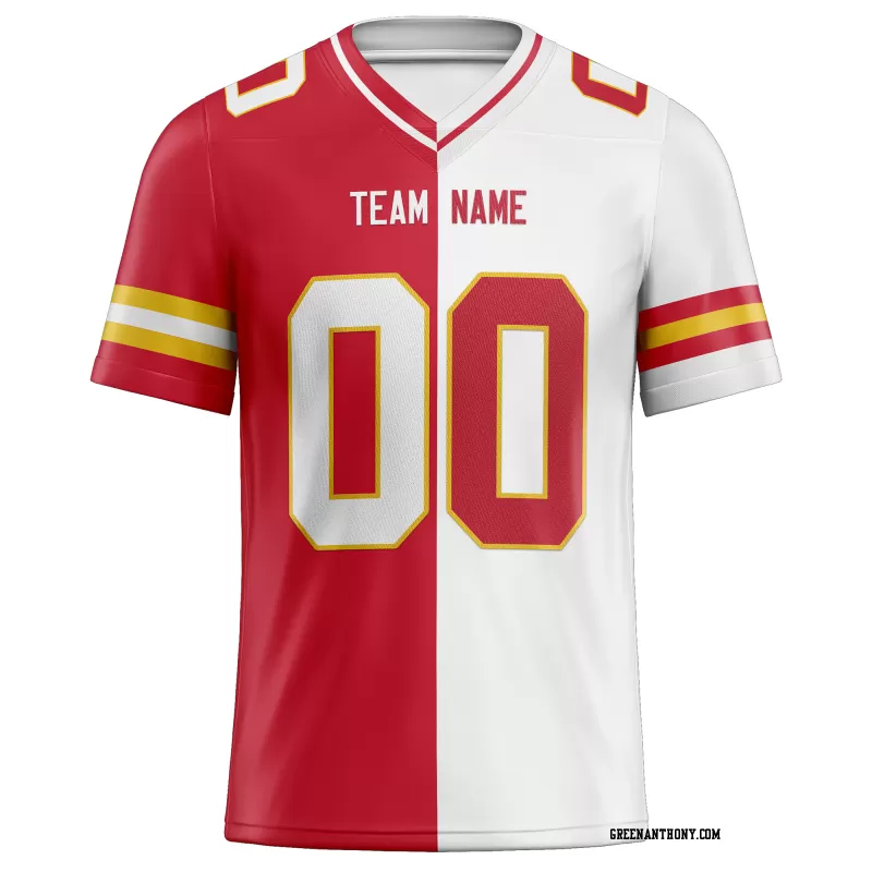 Explore the Printed Customized Split Red White White Football Jersey – a blend of vibrant colors and personalization, designed to make you stand out on the field. Perfect for football enthusiasts seeking a unique touch.