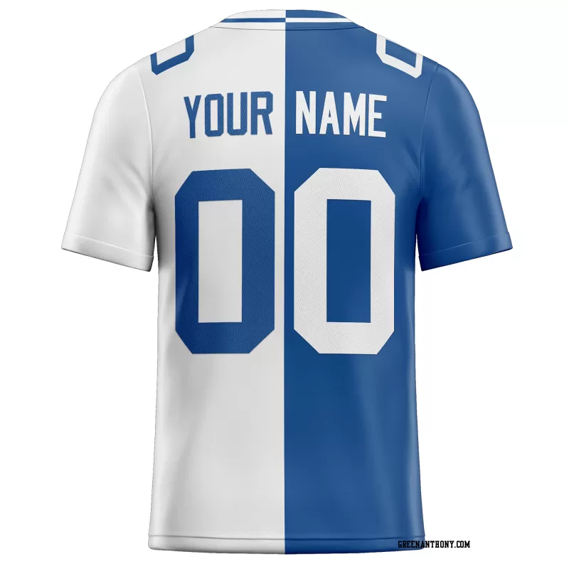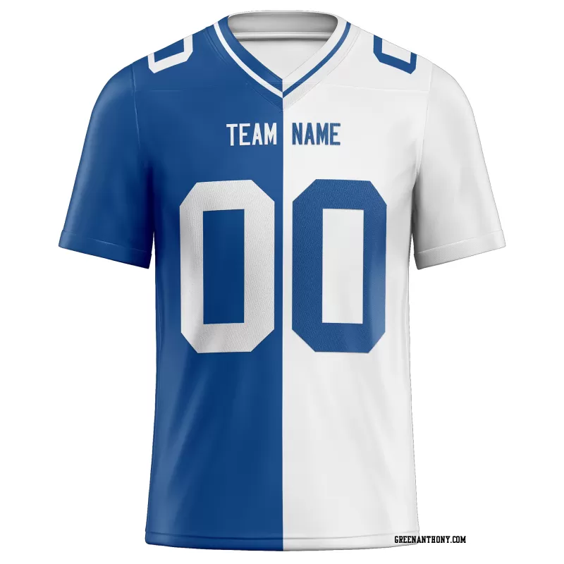Explore the Printed Customized Split Royal White White Football Jersey – a blend of vibrant colors and personalization, designed to make you stand out on the field. Perfect for football enthusiasts seeking a unique touch.