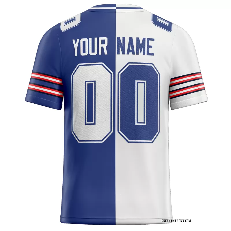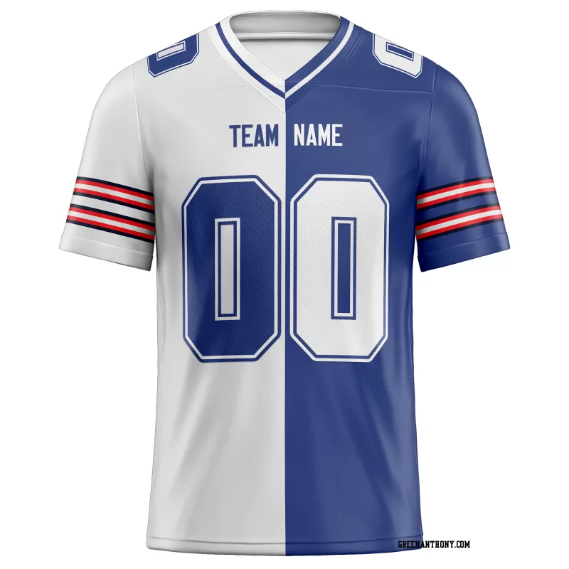 Explore the Printed Customized Split White Royal White Football Jersey – a blend of vibrant colors and personalization, designed to make you stand out on the field. Perfect for football enthusiasts seeking a unique touch.