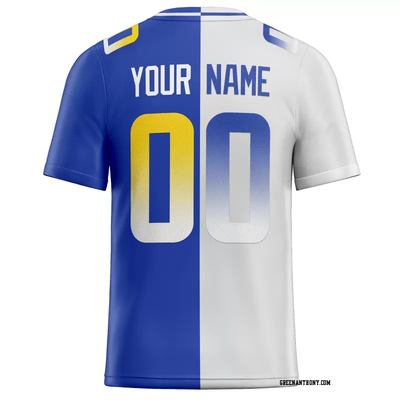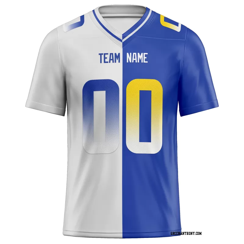 Explore the Printed Customized Split White Royal Yellow Football Jersey – a blend of vibrant colors and personalization, designed to make you stand out on the field. Perfect for football enthusiasts seeking a unique touch.